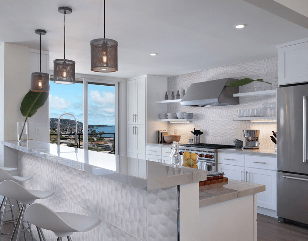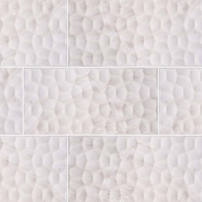 This backsplash tile features a soft white background with the iconic gray veins of natural marble. The addition of the patterned relief adds a contemporary detail.