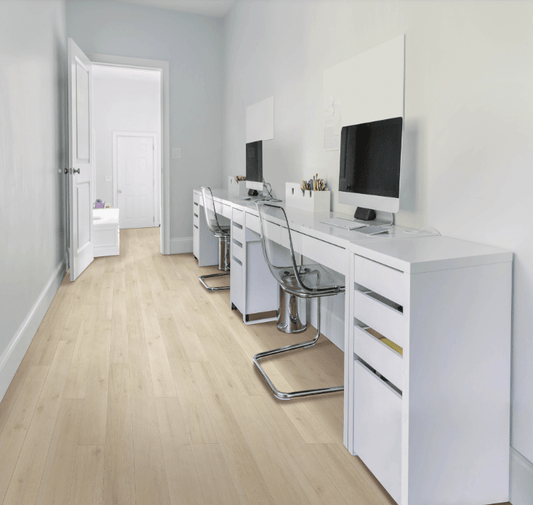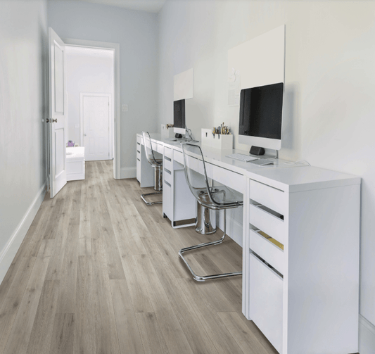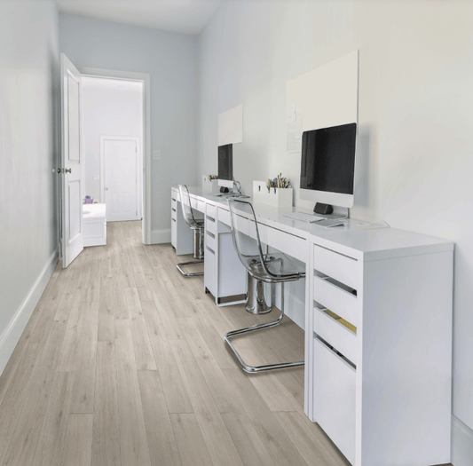 Escape the ordinary and step into a haven of tranquility with the Mohawk RevWood Plus Bellente laminate collection. This lineup of premium laminate flooring reimagines classic oak visuals with a serene washed palette of grays and taupes, perfect for crafting modern, light-filled spaces.