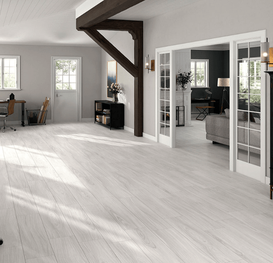 MSI Braxton Porcelain Wood Tile blends soft grays, whites, and delicate veins, exuding the warmth and charm of aged wood for rustic elegance.