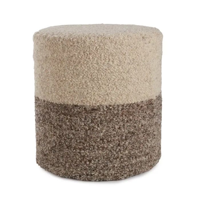 Crafted of wool, the cylinder pouf showcases boucle details and a color-blocked design.