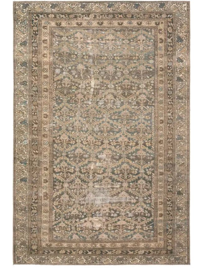 This exquisite piece features a vintage motifs in earthy tones of greens, grays, and creams.