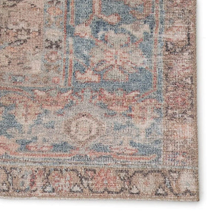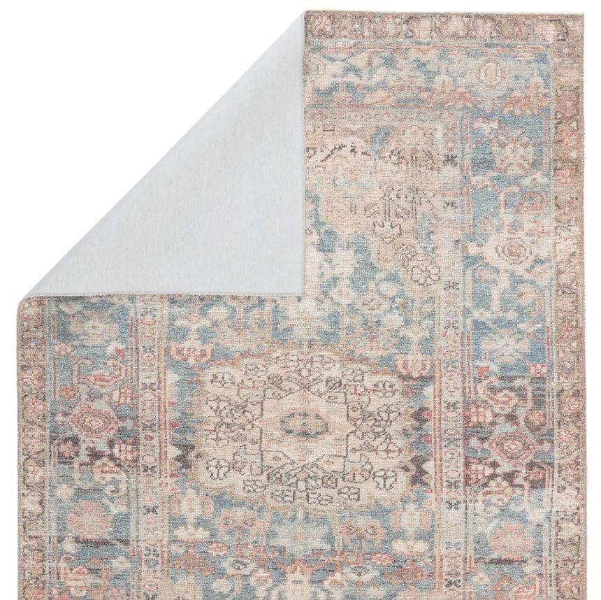 This area rug boasts a softly faded center medallion and floral accents in subdued tones of blue, gray, beige, and blush.