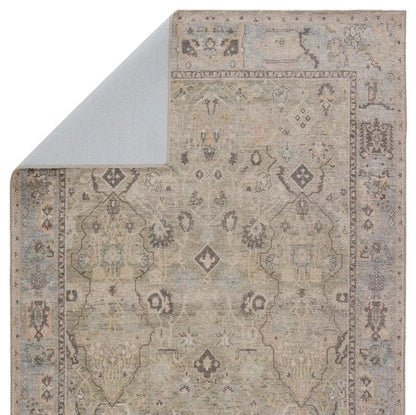 The Jaipur Living Kindred KND09 Washable Rug combines vintage elegance with modern style, featuring faded green, tan, and blue tones.