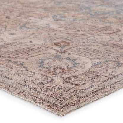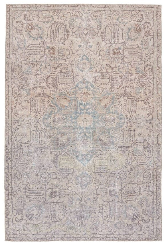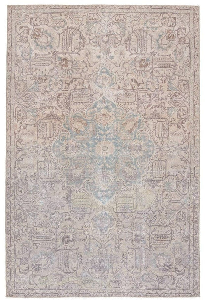 The Jaipur Living Kindred KND14 Washable Rug blends vintage elegance with modern style in subdued tan, beige, gray, and blue-green tones.
