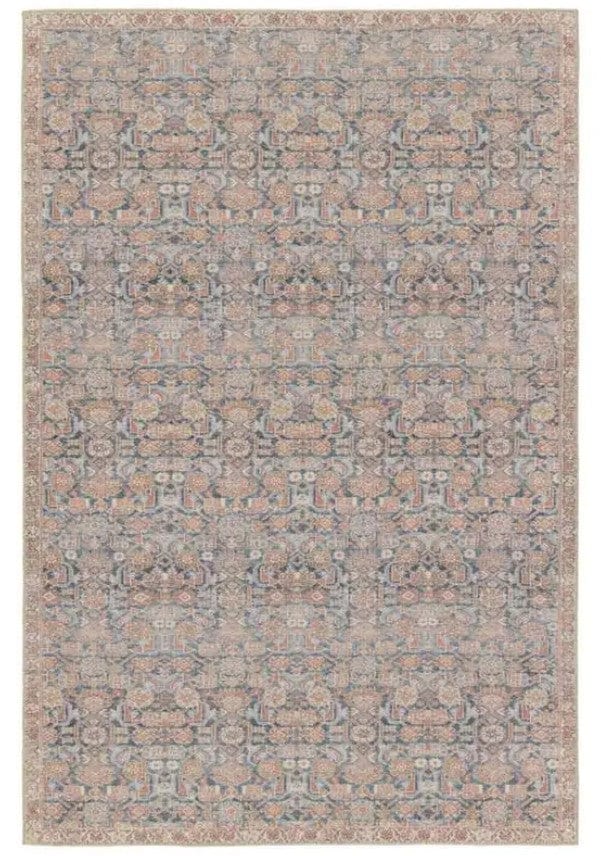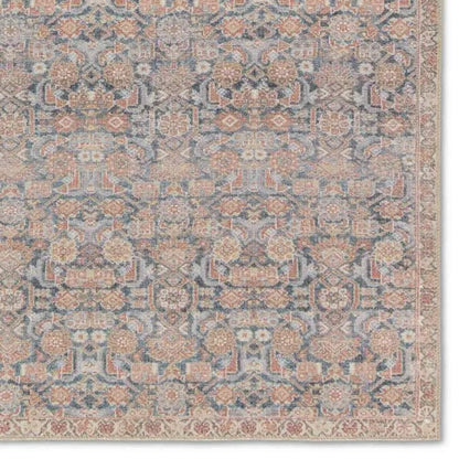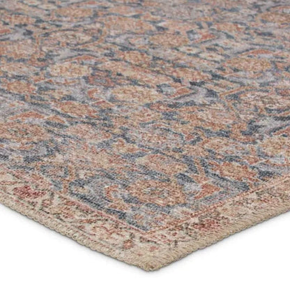 The Jaipur Living Kindred KND16 Rug features a distressed Turkish floral and geometric pattern in bronze, navy, tan, and green.