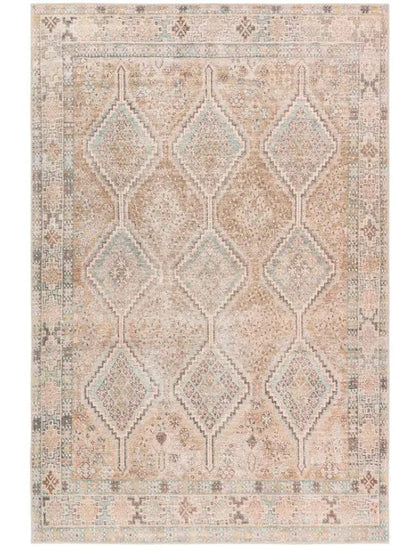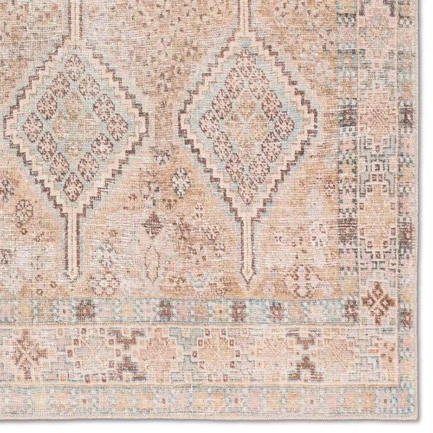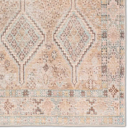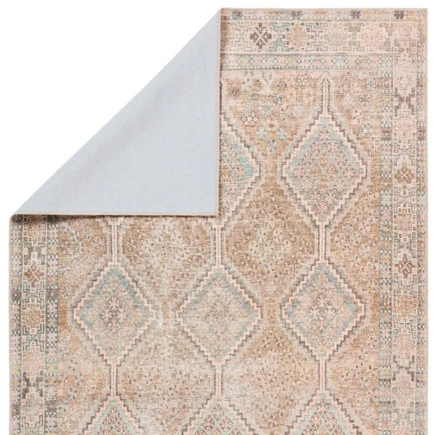 The Jaipur Living Kindred KND20 Washable Rug features a beautifully distressed Turkish diamond pattern in blue, gold, and brown.