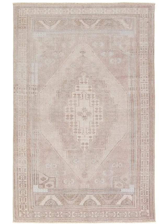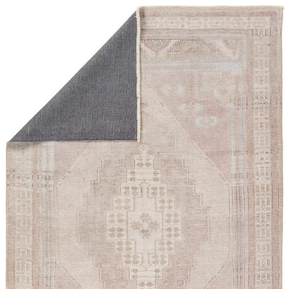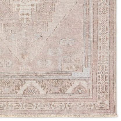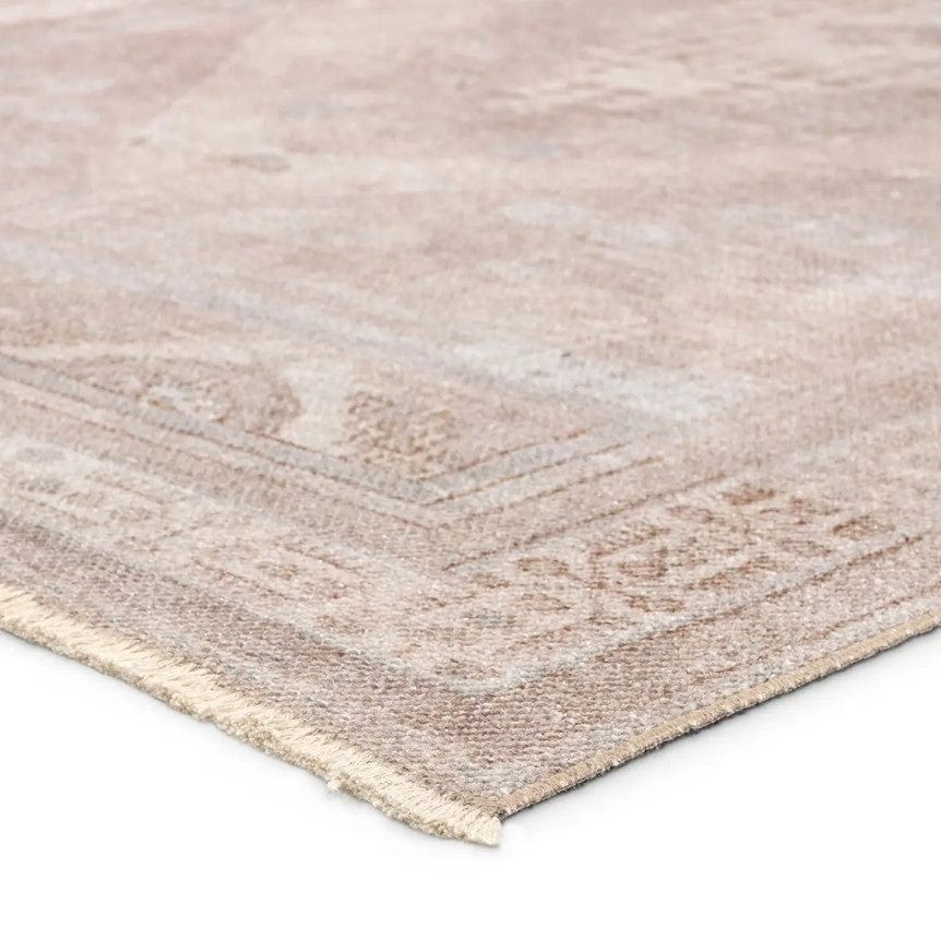 The Jaipur Living Lumal LML04 Washable Rug features distressed, vintage designs with Southwestern-inspired medallions and intricate detailing in mauve, light blue, brown, and cream.