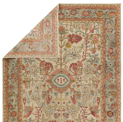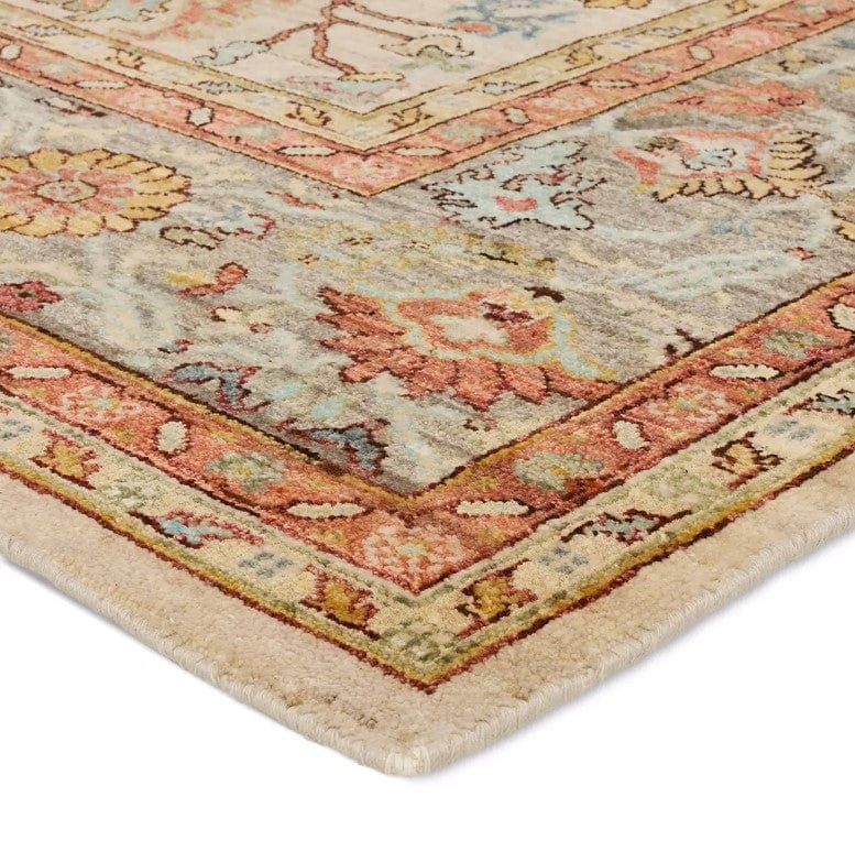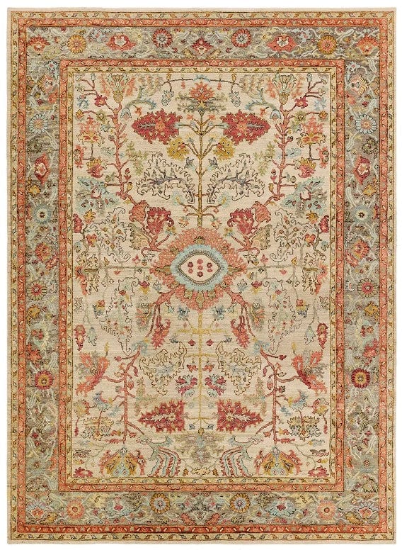 It features a bold color palette of pink, cream, blue, gray, green, and yellow, with an intricate design that includes a medallion and sprawling florals.