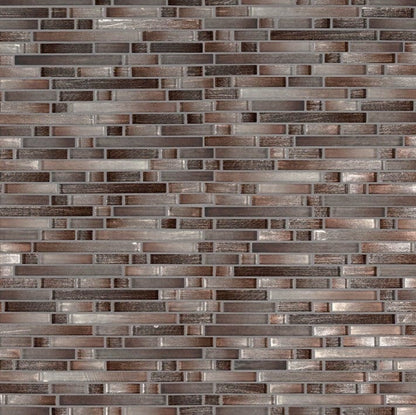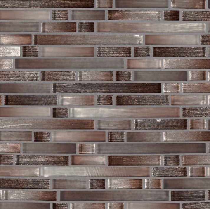 Akaya Copper Interlocking Glass Tile blends warm browns, deep reds, and icy pearl tones for a bold look.