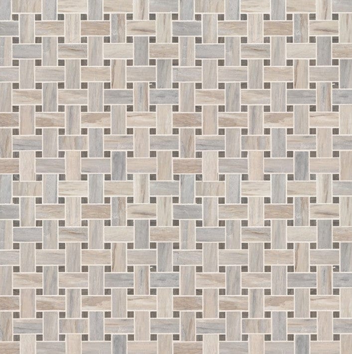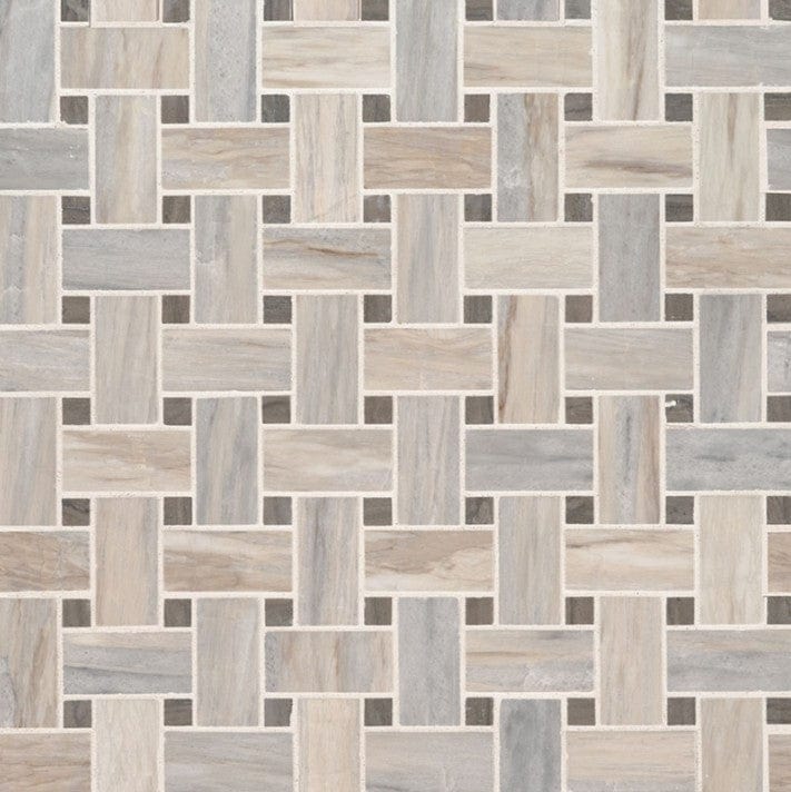 MSI Angora Basketweave Polished Tile features natural marble with a blend of cool grays and warm beiges.