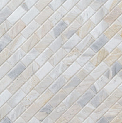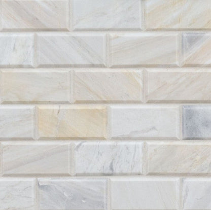Athena Gold Beveled Tile 2x4 features a warm white background accented with soft creams, grays, and honey tones for a serene look.