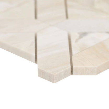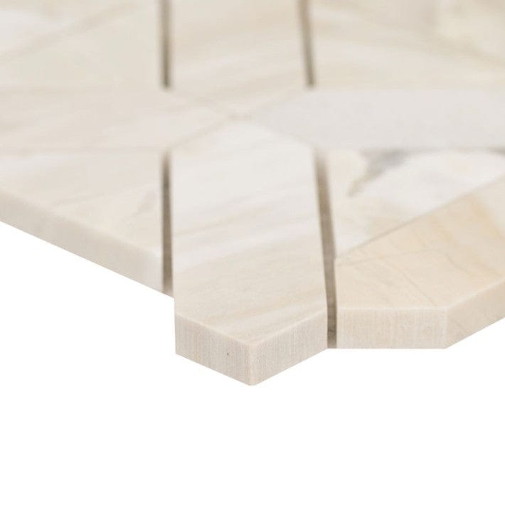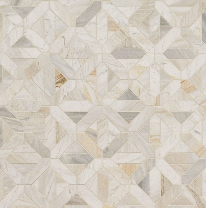 Athena Gold Geometrica Tile showcases a modern geometric design in warm white and soft gray hues.