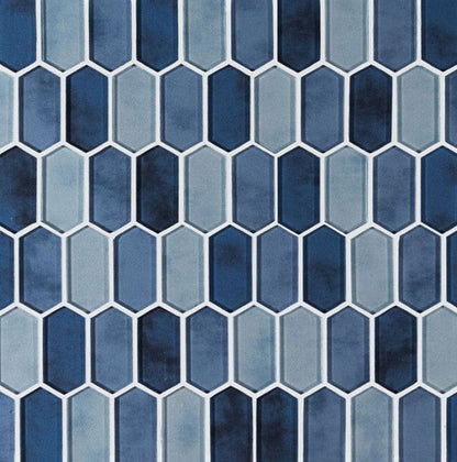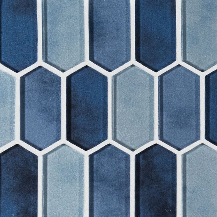 Boathouse Blue Picket Glass Tile showcases soothing blue tones in a sleek elongated hex pattern with a watercolor-like finish.