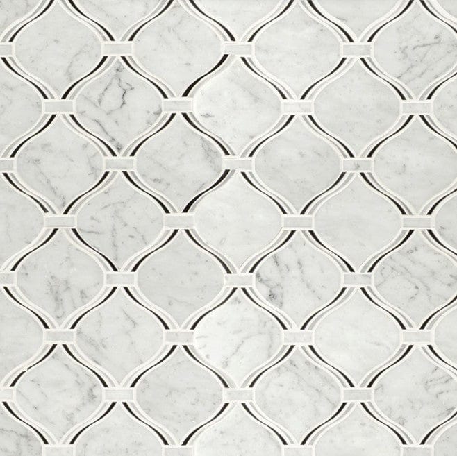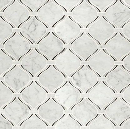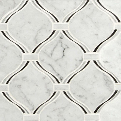 Danza Arabesque Tile updates the classic arabesque look with white-gray marble and dark accents.