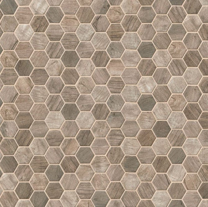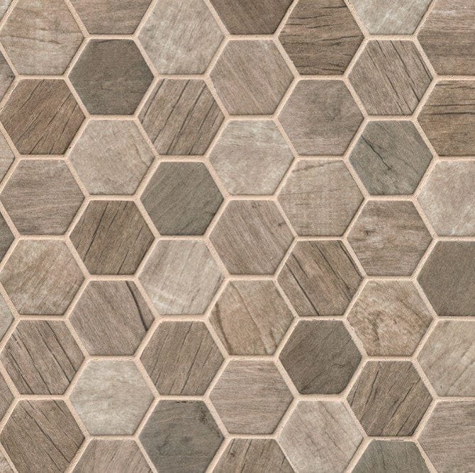 Driftwood Hexagon Mosaic Tile mimics sun-bleached wood in soft brown, greige, and cream tones.