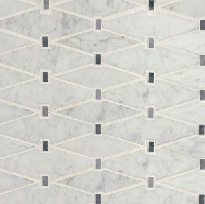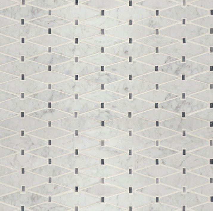 Marbella Diamond Tile showcases classic white marble with soft gray accents in a striking elongated diamond pattern.