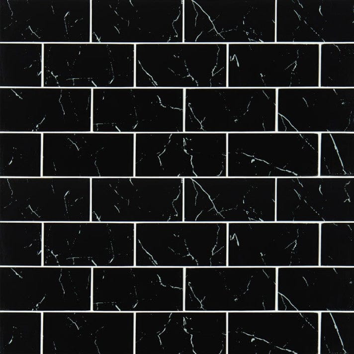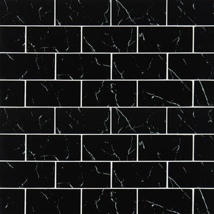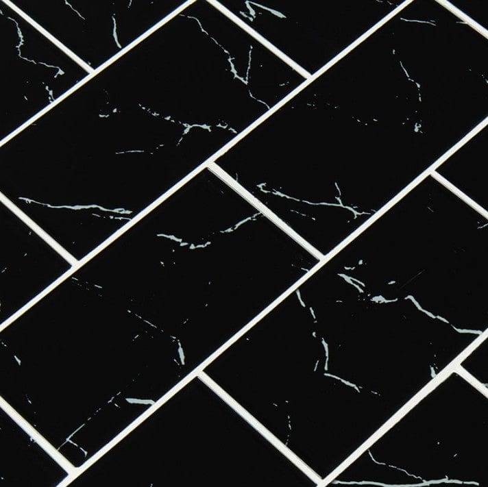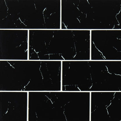Nero Marquina Glass 3x6 Tile showcases bold white veining on a rich black base, mimicking marble in sleek glass.